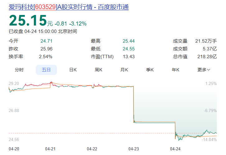 4月23日,A股开盘不久,电动自行车龙头企业爱玛科技股价突然闪崩跌停,截至24日收盘,股价跌3.12%报25.15元/股(创20个月来新低),市值两日蒸发32亿元,最新市值218.28亿元。